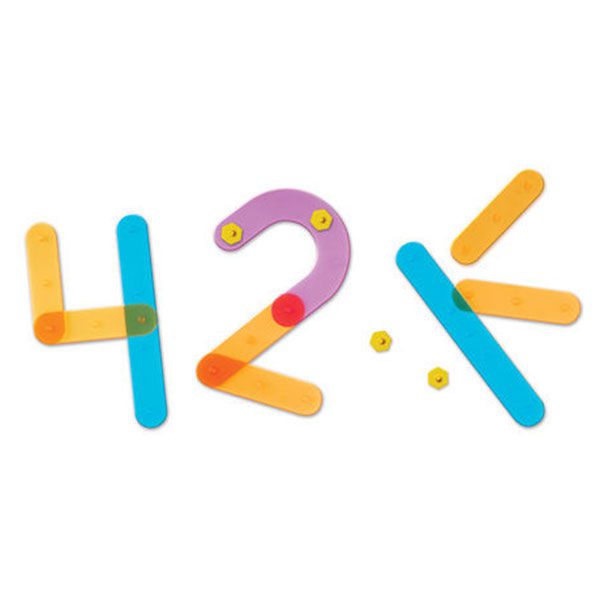 Este set incluye 50 piezas de números: 4 líneas rectas largas, 12 curvas en forma de C, 8 líneas rectas cortas, 20 puntos para números, 6 curvas y 5 tarjetas de actividades de dos caras.