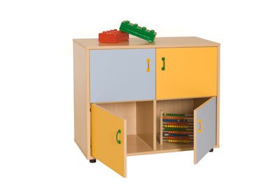 Muebles fabricados en melamina de 19 mm, color haya, cantos de PVC de 2 mm de grosor, acabado por las dos caras. Bordes redondeados para prevenir golpes con cantos vivos. Pies niveladores de PVC de 4 cm, para evitar la humedad y adaptarse a los desniveles. Estos pies pueden ser retirados del mueble para poder superponer diferentes armarios. Las puertas de los armarios con sistema antiatrapamiento de dedos en su cierre. Estante con herrajes de seguridad que evitan la manipulacio por parte de los ninos. Puertas en melamina de colores de 16 mm. con bisagras de gran calidad y multiples regulaciones. Cubetas fabricadas en polipropileno de gran resistencia y son extraibles mediante guias. Tiradores en verde o amarillo. colores disponibles