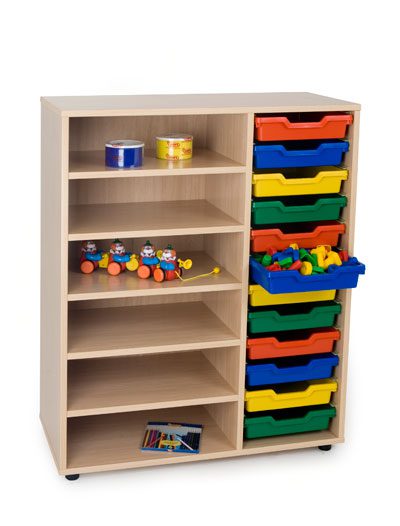 Muebles fabricados en melamina de 19 mm, color haya, cantos de PVC de 2 mm de grosor, acabado por las dos caras. Bordes redondeados para prevenir golpes con cantos vivos. Pies niveladores de PVC de 4 cm, para evitar la humedad y adaptarse a los desniveles. Estos pies pueden ser retirados del mueble para poder superponer diferentes armarios. Las puertas de los armarios con sistema antiatrapamiento de dedos en su cierre. Estante con herrajes de seguridad que evitan la manipulacio por parte de los ninos. Puertas en melamina de colores de 16 mm. con bisagras de gran calidad y multiples regulaciones. Cubetas fabricadas en polipropileno de gran resistencia y son extraibles mediante guias. Tiradores en verde o amarillo.