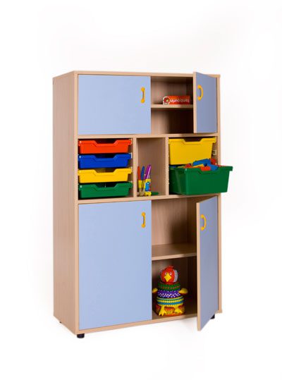 Muebles fabricados en melamina de 19 mm, color haya, cantos de PVC de 2 mm de grosor, acabado por las dos caras. Bordes redondeados para prevenir golpes con cantos vivos. Pies niveladores de PVC de 4 cm, para evitar la humedad y adaptarse a los desniveles. Estos pies pueden ser retirados del mueble para poder superponer diferentes armarios. Las puertas de los armarios con sistema antiatrapamiento de dedos en su cierre. Estante con herrajes de seguridad que evitan la manipulacio por parte de los ninos. Puertas en melamina de colores de 16 mm. con bisagras de gran calidad y multiples regulaciones. Cubetas fabricadas en polipropileno de gran resistencia y son extraibles mediante guias. Tiradores en verde o amarillo.