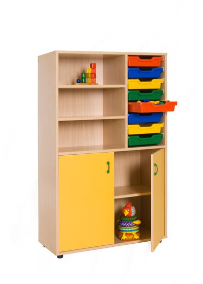 Muebles fabricados en melamina de 19 mm, color haya, cantos de PVC de 2 mm de grosor, acabado por las dos caras. Bordes redondeados para prevenir golpes con cantos vivos. Pies niveladores de PVC de 4 cm, para evitar la humedad y adaptarse a los desniveles. Estos pies pueden ser retirados del mueble para poder superponer diferentes armarios. Las puertas de los armarios con sistema antiatrapamiento de dedos en su cierre. Estante con herrajes de seguridad que evitan la manipulacio por parte de los ninos. Puertas en melamina de colores de 16 mm. con bisagras de gran calidad y multiples regulaciones. Cubetas fabricadas en polipropileno de gran resistencia y son extraibles mediante guias. Tiradores en verde o amarillo.