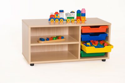 Muebles fabricados en melamina de 19 mm, color haya, cantos de PVC de 2 mm de grosor, acabado por las dos caras. Bordes redondeados para prevenir golpes con cantos vivos. Pies niveladores de PVC de 4 cm, para evitar la humedad y adaptarse a los desniveles. Estos pies pueden ser retirados del mueble para poder superponer diferentes armarios. Las puertas de los armarios con sistema antiatrapamiento de dedos en su cierre. Estante con herrajes de seguridad que evitan la manipulacio por parte de los ninos. Puertas en melamina de colores de 16 mm. con bisagras de gran calidad y multiples regulaciones. Cubetas fabricadas en polipropileno de gran resistencia y son extraibles mediante guias. Tiradores en verde o amarillo.