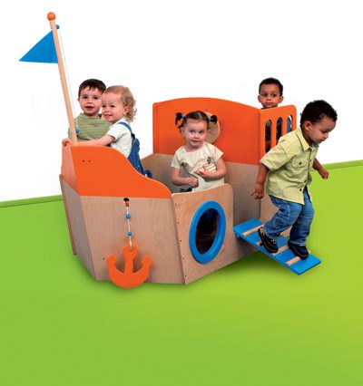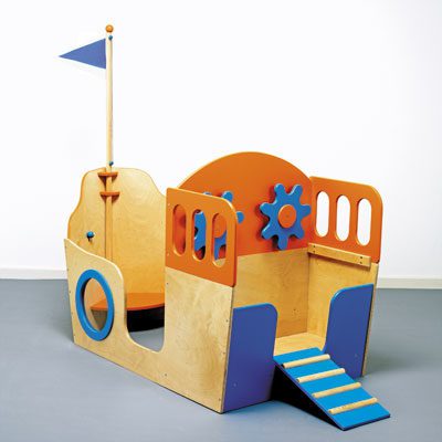 Un gran barco en colores vivos muy equipado, 2 barreras con ruedas, 1 brújula serigrafiada, 1 ancla, 1 cofre con tirador, 1 pasarela móvil, 2 ventanillas una de ellas cerrada con plexiglás y 1 mástil con su bandera. En madera contrachapada 18 mm, barnizada incolora y lacada azul y naranja. Una portilla cerrada por un plexiglás transparente. Dimensiones 156x78x95 cm. Con mástil altura 135 cm. Caida de la pasarela: 31 cm sobre el ancho.