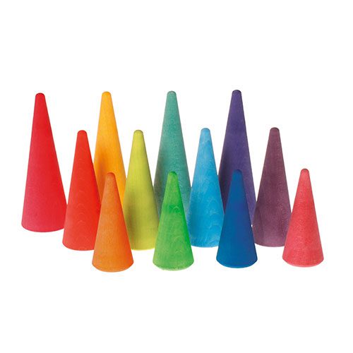 Piezas de madera con formas de copas de árbol. Estas piezas con formas de cono se pueden utilizar como tejados y combinar con bloques de construcción GRIMMS.