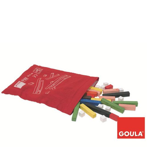 Contiene: Bolsa de tela. 55 regletas de madera de colores. Guía Pedagógica. Guía de ejemplos.