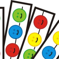 Bote de 140 botones y 10 cordones. Juego de ensartar, con grandes botones de 1 a 5 agujeros y en vivos colores. Para seriación y clasificación. Estimulan la motricidad fina. Incluyen en relieve la grafía del número y también su representación en braille. El conjunto se completa con fichas de actividades individuales y 10 cordones de 1 metro.