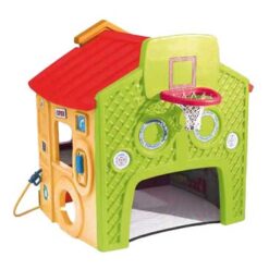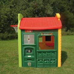 Cada lateral ofrece temas diferentes. Por un lado una canasta y una porteria. Por otro, una gasolinera con un surtidor un teléfono y mas detalles. Otro lado un supermercado cn cajero automático y en la parte frontal nos representa una escuela. Dimensiones: 140x124x147 cm.
