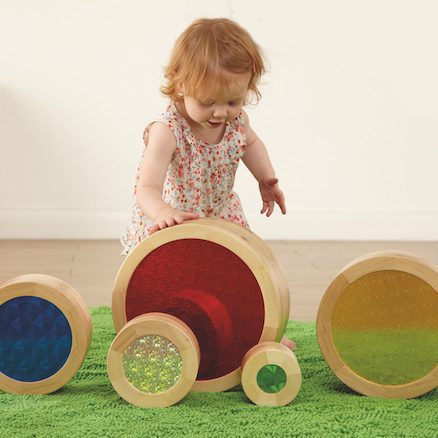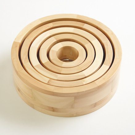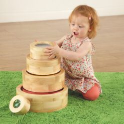 Un juego de cilindros táctiles de madera. En total 5 cilindros. Apilables.