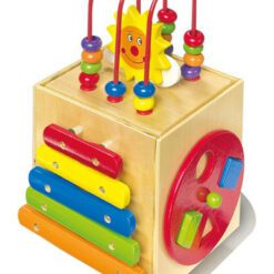 Xilofono, 2 juegos de insertables, reloj didactico y arcos de motricidad con bolas de madera multicolores. 5 lados de juego y diversion con efecto didactico. Aprox. 17×27 cm.