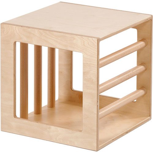 Cubo cerrado por ambos lados con una pared de barrotes de 3 cm de grosor. Estos lados sirven de sujección para la pasarela o bien para escalar. El cubo se puede utilizar tanto individualmente como en combinación con otros elementos del conjunto Pikler de Dusyma.