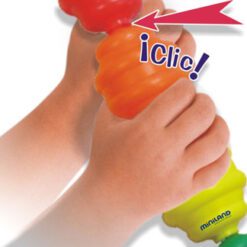 Grandes cuentas de textura y colores variados. Especialmente pensadas para manos pequeñas, tienen texturas variadas, lo que proporcionan un gran valor de juego, incluidas ciertas discapacidades. Su ensamblaje es por suave presión permaneciendo unidas en forma de cadeneta. Bote de 24 piezas.