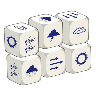 Un set de seis dados educativos, cada uno con ilustraciones de condiciones meteorológicas: nubes, sol, lluvia, nieve…