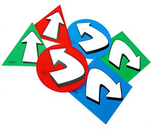 Tres formas grandes con flechas que indican izquierda, derecha y todo recto para dar práctica a la lateralidad de una forma activa. Dentro de los circuitos de psicomotricidad se complementan estupendamente con las tiras, salta al número, manos y pies, etc. 6 flechas en formas de plástico flexible y 6 plantillas de formas.