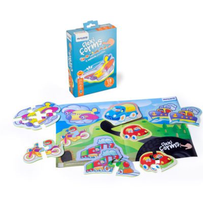 8 piezas flexibles de 10X10 cm para formar 6 vehículos. Y 1 Guía de actividades adicional.
