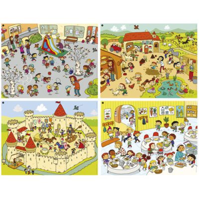 13 carteles desgranan la vida diaria de una clase de 26 niños. Cada ilustración propone una situación en la que se representan más de 20 acciones y comportamientos distintos. La observación de los personajes y de sus acciones permite al alumno desarrollar progresivamente su sentido crítico y reflexionar sobre la convivencia.
