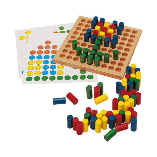 88 cilindros de madera fabricados en 4 colores distintos. Tablero de madera lacada. Tamaño del tablero: 22×22 cm.
