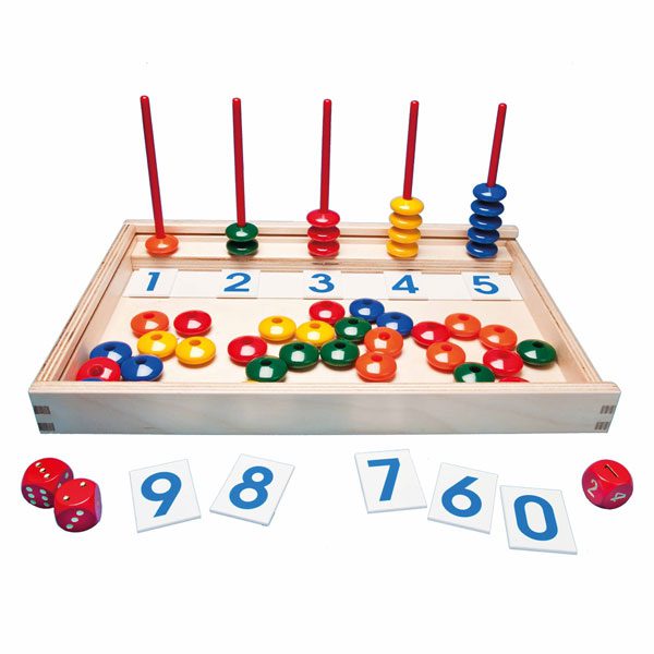 Juego magnético de números contiene: Diez tarjetas de plástico magnéticas con números del 0 – 9. Cinco varillas de plástico, Cincuenta cuentas de plástico en 5 colores, Dos dados de madera con números punteados del 1 al 6. Un dado de madera con números marcados de 1 al 5.