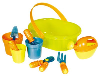 Herramientas y accesorios completamente seguros. Cesto de plástico con asa para transportar y guardar. Incluye regadera, 3 maceteros, 1 tijera podadora, 1 paleta, 1 rastrillo, 2 palas para excavar.