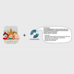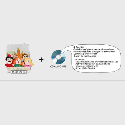 Set de 6 marionetas (4 de ellas reversibles con 2 caras diferentes) con un CD audio MP3 que contiene la grabación completa, con música y diálogos, de 2 cuentos. La representación de los cuentos con las marionetas permite a los niños descubri las emociones. El CD audio MP3 incluye libreto con los textos de los cuentos y guía pedagógica con actividades para trabajar las emociones. La duración aproximada de cada cuento es de 10 minutos.