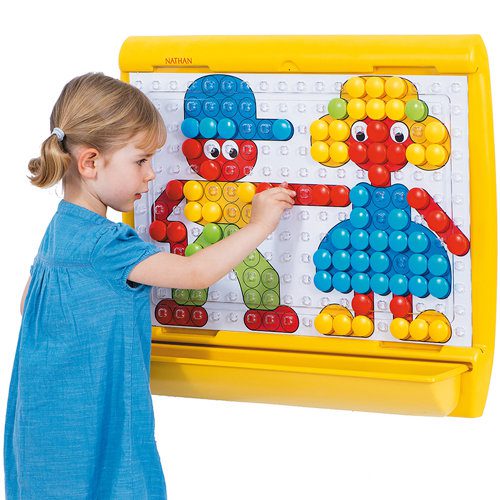 Láminas con modelos por ambos lados con ideas para representar formas figurativas o mosaicos que se colocan en la rejilla. Los niños rellenan los dibujos con fichas redondas que se encajan en la rejilla con una ligera presión.