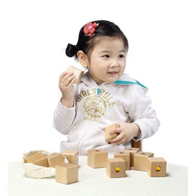 12 cubos sonoros de madera. Al sacudir los cubos, el niño debe reconocer