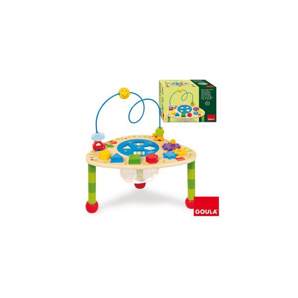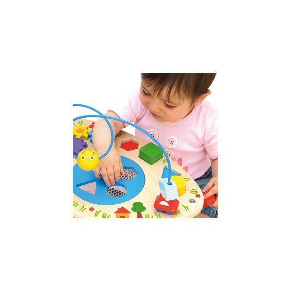 Mesa de madera con múltiples actividades que desarrolla la motricidad fina.