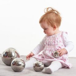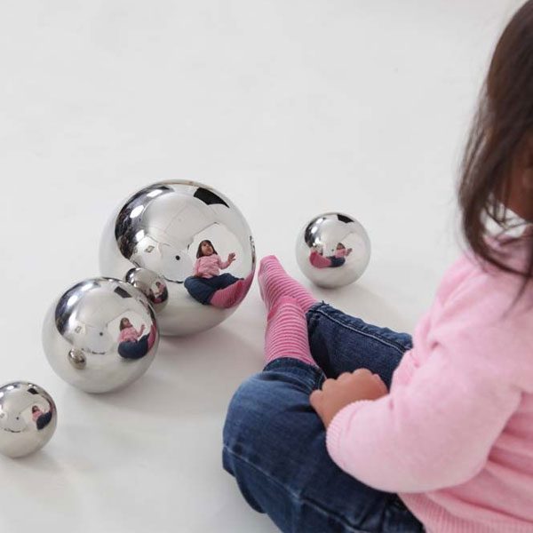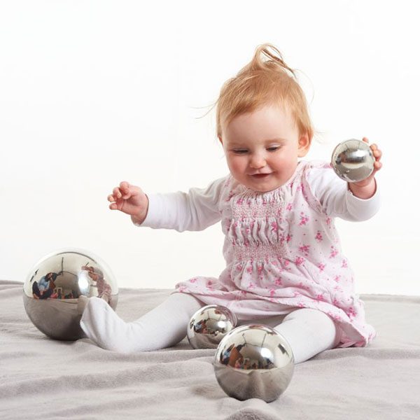 Pelotas reflectiva sensoriales de color plata recubiertas de acero inoxidable. Tamaños: Diámetro de 60, 80, 100, 150 mm.