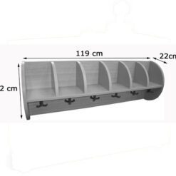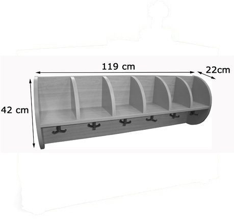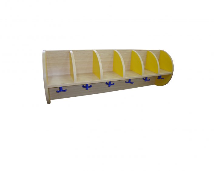 Mueble casillero con 6 casillas de separaciones redondeadas y extremos en forma de semicírculo, fabricado en melamina de haya, con tablero de 19 mm separadores de casillas y trasera de 19 mm, para ofrecer mayor rigidez, estabilidad y sujeción, cantos de PVC de 2mm. Dispone de 6 perchas giratorias fabricadas en polipropileno con aristas redondeadas y sistema triple colgador, para poder colgar la vestimenta del niño.