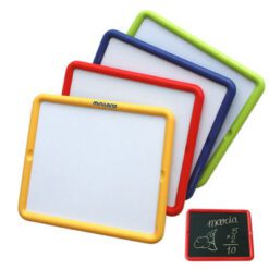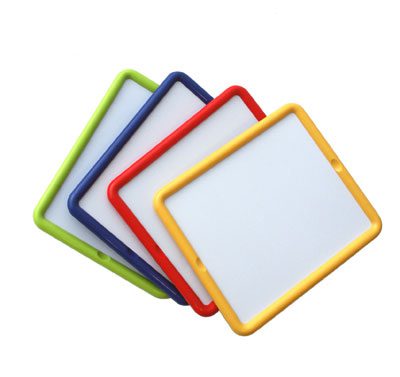 Set de 4 pizarras metálicas con marco de plástico de 30×26 cm. Lacara blanca se utiliza con el rotulador. la negra con las tizas y ambas caras pueden utilizarse con las letras y números magnéticos.