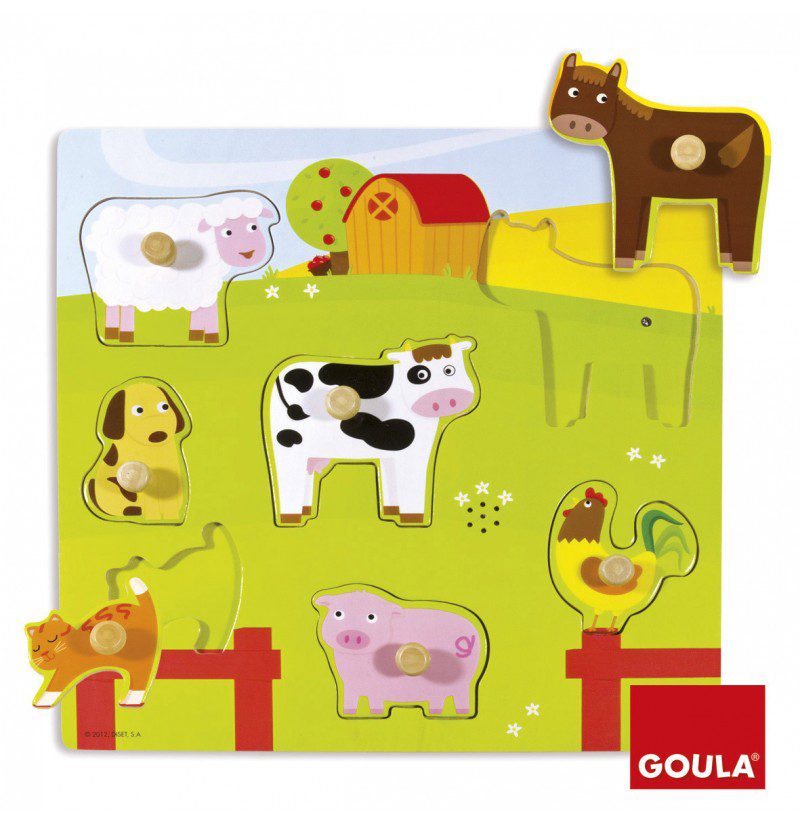Diviértete y aprende los diferentes sonidos de diferentes animalitos de una granja con este puzzle de madera.