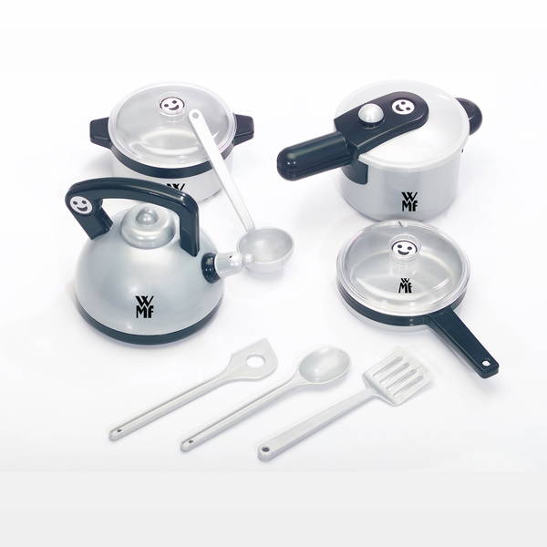 Para nuestros pequeños chefs, les presentamos este conjunto que trae una olla exprés, una marmita con silbido, una cacerola y sartén con tapas y 3 utensilios más para remover la comida.