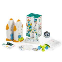 Contenido del juego: 1 Cohete, 40 pinchos de combustible, 18 tarjetas reto, 40 tarjetas número, 1 dado, 1 bolsa de tela y 1 guía didáctica.