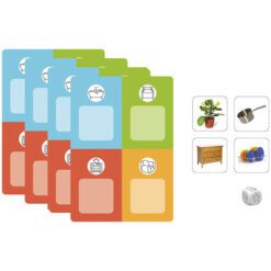 La caja contiene: 1 juego de loto: 4 láminas de juego (15 x 21 cm), 24 tarjetas ilustradas (5 x 5 cm) y 1 dado con instrucciones. 1 juego de las pajeras: 1 tablero (42 x 30 cm), 20 fichas «sonrisa», 4 fichas de jugador y 1 dado. 1 juego de los colores: 1 tablero (42 x 30 cm), 4 fichas de jugador y 1 dado con instrucciones. 3 reglas del juego.