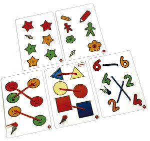 Un juego de hilado y lógica para unir conceptos como: los colores, los tamaños, las formas, los numeros y las expresiones, por delante y por detrás. Cinco tarjetas serigrafiadas por ambos lados y 5 cordones de colores.